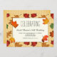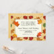 Fall födelsedagsfest firande inbjudan. Fallande löv-design, på en gyllene gult stripe-bakgrund. Modern, hög, utskriven text överst, med anpassning för vilken ålder som helst. Vågrät 5 x 7-tums stationär dator med uppgraderingsalternativ.