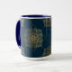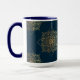 Ett mönster av vackra guld mandalas som upprepas i ett ornatdammmönster. Guld är blankt för att imitera äkta guld-folie. Mandalerna är designade med trångsynta, hand plockade-linor och placerade på en djup marin blå bakgrund. Anpassa monogrammet i ram!