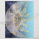 Ett vitsiskt, mystiskt universum nebula guld-krescerande måne och vågigt strålarna sol mandala celestial, med ett halvmånsstadium som ger måne med mandala blommor och mörk blått nebula galaxystjärnor, punkter, cirkleformer, sjöjungfruar och vågigt rockor sol mandala, blommigt och löv dockkonst, gjord med en faux gult guld struktur, och dagsljus himlar blå bakgrund. Detta vackra, mystiska, söta måne och sol henna mandala stil universum, originalkonstverk är perfekt för hemdekoration, vardaglig bära, särskilda tillfällen eller tematiska dekorationer.
