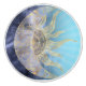Ett vitsiskt, mystiskt universum nebula guld-krescerande måne och vågigt strålarna sol mandala celestial, med ett halvmånsstadium som ger måne med mandala blommor och mörk blått nebula galaxystjärnor, punkter, cirkleformer, sjöjungfruar och vågigt rockor sol mandala, blommigt och löv dockkonst, gjord med en faux gult guld struktur, och dagsljus himlar blå bakgrund. Detta vackra, mystiska, söta måne och sol henna mandala stil universum, originalkonstverk är perfekt för hemdekoration, vardaglig bära, särskilda tillfällen eller tematiska dekorationer.