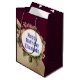 Grattis på födelsedagen<Name>presentsäck med en gyllene marmor mönster och ett fast burgunskt färg med diagonalt skikt. En cirkel med faux guld foil gräns som är överlagrad över en söt blommigt bouquet med ro, nejlikor och andra blommor.