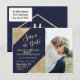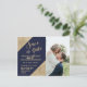 Elegant, chic och glamourös falskt tryckt guldglitter sekvens hörn och guldskrift på en marinblå bakgrund, Spara-datum bröllopskort. Denna klassiska och sofistikerade design är perfekt för det trendiga och stiliga brudparet. Personifiera med ditt eget meddelande på framsidan samt en anpassad monograminitial på baksidan. Allt fototryck design.