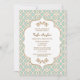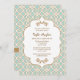 Eleganta och härliga franska marockanska inspirerade inbjudningskort för möhippan med upprepande äggskalstunna blått, en blek aqua, en ljus blåaktig grön kricka och ett guld- geometriskt mönster planlägger, och den guld- hued blommigten frodasr. Denna exklusiva och luxe inbjudan är perfekt för any formellt, exotiskt, marockanskt, arab på nätterna eller Aladdin den themed möhippan. Baksidaen av dessa anpassningsbar, utsmyckade raminbjudningar och meddelanden kan personifieras med snart för att vara brud monogram, och händelsenamn på quatrefoilen formar och skrivev ut bandlookdesign. Konstverk och design© Chrissy H. Studio, LLC. All reserverad rättigheter.