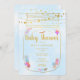 En söt babyduschinbjudan med guld-sträng ljus ovanför ett guld Mason burk fylld med personlig och utspridda, ömtåliga blommor på blå molnbakgrund. Designad av Thisisnotme©