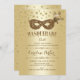 Ro Guld Rosa Masquerad Boll Födelsedagsfest inbjudan Elegant med Faux glitter guld. Har en mask med fjädrar, konfekti och snyggt av skriptteckensnitt. Kan vara personlig i vilken ålder eller händelse som helst. Berätta om du behöver anpassa dig ytterligare.