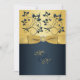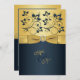 Den monogrammade bröllopsinbjudan för guld och marinblått blommigt har en tryckt nos på guld-bandet och med en tryckt gemen- och diamantjuvelbrok på den. Texten är allt anpassade. Den pappra typen är också anpassade. Om du behöver några andra objekt i den här designen kan du skicka e-post med din förfrågan till niteowlstudio@gmail.com