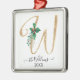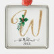 Jul Holly Foliage Metall Ornament med elegant Guld Glitter Monogram W och din familj Namn, tredimensionellt guld glitter-utseende, handskrivna manus monogram brev W, din familj namn i handskriftsskript och året. Vackra vattenfärger målade holly med rött burgudyga vinterbär tillsammans med löv blad och guldgröna hand plockade. Konst- och grafisk design av en internationellt licensierad konstnär, Audrey Jeanne Roberts, upphovsrätt.