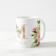 Ett personlig kaffe mugg med ett faux guld brev ’M’-monogram, med dekorativ blommigt för vattenfärg och bladillustrationer. Anpassa det enkelt med ditt namn eller skapa en unik gåva till dina nära.