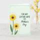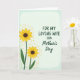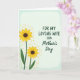Denna gratulationskort har en mjuk, blek mintgrön bakgrund med rundade hörn och en tunn akvagrön kant, som ger en lugn vårkänsla. Längs vänster sida reser sig två stiliserade blommor uppåt på smala skogsgröna stjälkar, med varsamt böjda blad som lutar sig mot varandra som nära vänner. Varje blomma har guldfärgade kronblad som omger en mörkbrun, texturerad mitt, och paret känns sammanlänkat genom sina matchande former och det sätt på vilket de tycks "titta" i samma riktning ❤️. Små guldfärgade orangefärgade prickar är utspridda över ytan som drivande pollen, vilket ger en lätt, firande glans. På höger sida är meddelandet arrangerat i staplade rader, med "TILL MIN KÄRA HUSTRU" i krispiga versaler ovanför "på mors dag" i jämnare, flytande bokstäver. Texten visas i en mörk ton som sticker ut tydligt mot mintfältet, med generöst utrymme runt omkring. Några av de guldfärgade