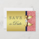 Eleganta, personliga skräddarsydda guldfärgade, korallfärgade och marinblå platta "save the date"-kort med vackra paljetter, blanktryckta band och slingor och snygga diamantglittrande juveler på en glamourös guldfärgad gradientbakgrund. OBS: Dessa är platta tryckta bilder - inga upphöjda delar. Om du behöver hjälp med att anpassa din produkt, vänligen kontakta mig via min butik. Jag hjälper gärna. Jag har matchande produkter för bröllop i min butik. Kopiera och klistra in denna länk i din webbläsare för att se hela brölloppskollektionen: