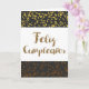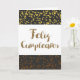 Ett svart och guld-spanskt födelsedagskort med guld konetti-format i bakgrunden med "Feliz Cumpleanos" hälsning i ett utkast från guld glitter. Observera att det inte finns någon egentlig glitter, utan en glitter-designeffekt. Du kan anpassa det inre meddelandet om du vill.