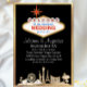 Den här bröllopsinbjudan innehåller ett klassiskt Las Vegas-tema på en svart bakgrund. En skyltbild av Vegas-remsan skrivs ut över grund-delen i guld mönster. En matchande guld ram gräns inbjudan. Den klassiska "Välkommen till Las Vegas"-skylten skrivs ut överst. Du kan anpassa tecknet så att det innehåller din egen personligt bröllp-information eller annan text.
