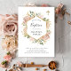 Dessa häpnadsväckande Baptism- eller julklappningsinbjudningar har ett faux guld-utseende guld-geometriskt ram omgivet av blommor av lush, vattenfärgad neutralt i neutralt, jordtoner färg som beige peach, dammig ro och mjuk grönt med faux guld accents och löv. En guld kor visas också överst. En elegant boho-blommigt tittar på en helt vit bakgrund som är könsneutral och är perfekt för antingen din pojke eller flicka i din katolska eller andra kristna religiösa-ceremoni.