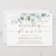 Denna inbjudan till repetitionmiddagen presenterar målad akvarell eukalyptus, botanisk grönska och guldglittrande blad med guldbokstäver.