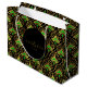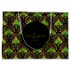 Guld och grönt Art Deco mönster över en svart bakgrund.
