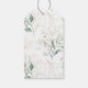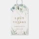 I bröllop tackar vi dig för märkrn med presenter med färgade vattenfärger eukalyptus, botanisk grönt, guld glitter löv med guld och grönt barr mönster på baksidan.