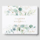 Den här gästen bok i bröllop har färgade eucalyptus, botaniska gröntar och guld glitter löv med guld-skript.