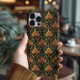 Guld och röd Art Deco mönster över en svart bakgrund.