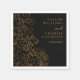 Napkin från elegant bröllop har en delikat blommigt för prydnadsmönster med blommor, fåglar och löv på guld och svart bakgrund. Texten kombinerar handskript och serif typsnitt för en snyggt och ett modernt utseende. Perfekt för vinter- eller höstfallbröllop.