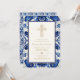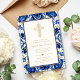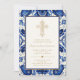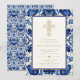 Bjud in dina gäster med dessa eleganta, traditionella och utsmyckade dopkakor med guldkors! Designen har ett utsmyckat guldkors och en blå medelhavsstil kakelbakgrund. Anpassa med dina egna detaljer.