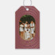 En vacker märkre för julklapp i familjen som kan anpassas med din text och ditt familjefoto. Golden Julafton accents with oval framing and deep mauve rosa bakgrund färg.