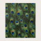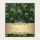Vikta påfågelshyllningskort med vacker guld juvel i mitten på en vacker påfågelsfjäderbakgrund.