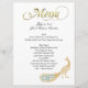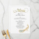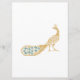 Menyer för bord för elegant bröllopmottagandet som gjordes i vit, med diagram av en prydde med pärlor ett goldtone och färgad, tittar påfågeln, på grunden. Menyn i goldtone utsmyckat grafiskt skrivar text, dekorerar det bästa av menyn. Alla svart text är klar att personifiera för ditt bröllopmottagande.