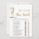 "Guldpärlor och Prosecco Han sa, Hon sa-leken" är ett förtjusande tillskott till din bröllopsfest. Med eleganta guldpärlor och prosecco-motiv ger det här spelet en touch av sofistikation till evenemanget. Gästerna kommer att ha roligt att gissa vem som sa vad medan de delar anekdoter och minnen, vilket gör det till en rolig och minnesvärd upplevelse för alla.