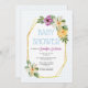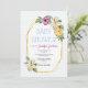 Guldfolie-polygon och vattenfärgade blommor flicka duschblåinbjudan. Den har en vacker vattenfärgad bukett med lila, gult och vita blommor och grönt löv. Texten är i en vit ram med en polygonram med guld folie. Bakom den finns en polkapunkt mönster.