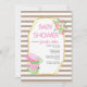 Guldfolie-polygon, tekopp och blommor, rustiskt te party flicka duschinbjudan. Den har rosa och grönt tekopp, blommor och löv. Texten står i ett vitt ram med guld-folie polygon ram. Bakom den finns ett strippat mönster med brunt och vitt rand.