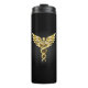 Guld polygonCaduceus-symboler på svart, isolerad bakgrund. Läkemedelssymbol med låg polyester.