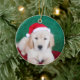 Fotografera av åtta vecka en gammal guld- retrievervalp som ha på sig ett Santa lock med en röd och grön bakgrund. Detta avbildar är van vid skapar en guld- prydnad för retrievervalpjulgran.