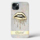 Metallisk droppning av läppar och guld konfekti på en holografisk bakgrund och ditt namn.