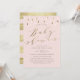 Rosa, modern och elegant babyduschinbjudan med regndroppar och kalligrafi av faux guld. Baksida med guld rand.