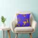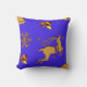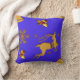 En julkudde med en gyllene renare, guld holly med röda rubies för bär, guldsnöflingor och stjärnor som ställs mot en festlig, traditionell julblå bakgrund för att ge ett färgstarkt och festligt utseende på din julhemsdeka i julhelg.