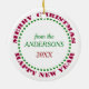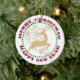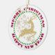 Ett faux glitter guld-renar läcker ut mot silvret guld snöflingor som faller runt honom.Bilden omges av en grönt prickad, cirkelformad ram och den cirkulära texten i röd God jul Gott nytt år. Cute! Bilden och texten placeras på en vit bakgrund. Baksidan av dekorationen har samma röda och grönt runt ram runt anpassningsbarna. En söt Helgdag till ge som gåva eller behålla för dig själv!
