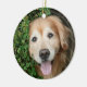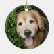 Denna julprydnad presenterar en fotografera av en le guld- retrieverhund som plirar ut bakifrån en grön buske.