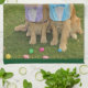 Denna kökshandduk presenterar guld- retrieversuppklädd och att gå på en påskäggjakt.