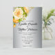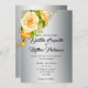 En vacker guldfärgad blommigt och en bröllopsinbjudning i silver, med en bukett av vackert gul ros i det övre lämnat hörnet, på en metallisk bas i silver. Alla detaljer kan enkelt ändras till kostym genom att klicka på länken Anpassa mallen ovan. Baksidan av inbjudan har samma bakgrund i silver, med guld bukett med rosor i mitten.
