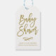 Elegant och märkre för rejäla babyduschgåvor med guld borstar modern kalligrafi med vit löv mönster. Den här presenten-märkrn är en perfekt för party favors. Det finns tillgängliga alternativ för att matcha objekt som inbjudningar och poster.