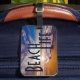 Guld- sandig strand för strandliv med surfa bagagebricka
