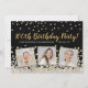 Elegant anpassningsbar födelsedagsfest inbjudan-design med guld och silver konetti över en svart bakgrund, modern skripttypografi med ord "100:e Födelsedagsfesten" (i guld), ditt namn och födelsedatum (i silver) och tre av dina favoritfoton i guld. Anpassa den med dina party-uppgifter på inbjudan.