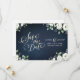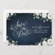 Modern faux guld sparar datumet calligraphy och vattenfärgsvit blommigt eucalyptus grey på mörkens blå bakgrund, elegant och snyggt, underbar för grönt rustiskt bröllop, botaniskt trädgårdsbröllop, boho blommigt bröllop under sommar och vinter. Visa alla matchande delar i samlingen.