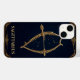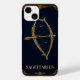 Detaljerad konstnärlig skildring av stjärntecknet Skytten, som visar en gyllene båge och pil med utsmyckade detaljer mot en djupblå bakgrund med stjärnaccents och dekorativa utsmyckningar.