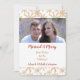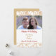 Den här plana julkortsmallen sätter dina fotografier i centrum med en fin guld- och vit vattenfärgssnöflingemönstrad ram längst upp och längst ned. Din anpassade text är i matchande guld och rött i mitten på en vit bakgrund. Vi har visat ett "Gift & Glad" tema, men all text kan enkelt anpassas, så denna design kan anpassas till alla situationer, inklusive ett familjefotografi. Baksidan av kortet är i matchande guld. *Erkännande av snöflingemönster till ATArtDigital*