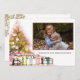 Elegant guld snöflingor, gräs träd med presenter och ditt foto.