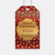 Denna vackra märkre av gåva är förtrollad med perfekten Juli färg. Guld och mörk röd, bakgrunden är mycket chic med snöflingor mönster. Den centrala gyllene formen välkomnar er hälsning. God jul!