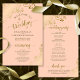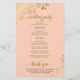 Dessa bröllopsprogram är eleganter och smakfulla, samtidigt som de fortfarande är budgetvänliga. Utformningen har formen av golden faux foil snöre med guld på en färgad i korallpersikobakgrunden. Typografin har gammalt manusyrgrafi, och det finns utrymme för detaljer om ceremonin, brudens sida, och ett kort-tack.