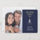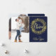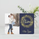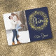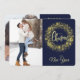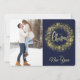 Två av dina favoritfoton är funktionerna på det här platta Helgdag för söt. Fotot på framsidan gränsas av en bild av en gnistrande snöflingande andedräkt från guld. Den stiliserade texten i mitten av blek guld säger "GOD JUL". Allt placeras i en mörk blått bakgrund. Ditt andra foto på baksidan är kantat av en bild av silver Julgran och din egen anpassningsbar i tre enkla textväxlar i fält. Elegant!