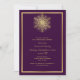 Guld snowflake på lila vinterbröllopsmiddagsinbjudan till elegant om sommartid som innehåller en gyllene snöflake på mörkens lila av äggplanta. Denna personlig är en komplett mall för anpassade och ingår i en perfekt med fast bröllop för en vinter i december eller jul i bröllop.